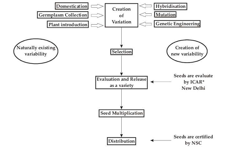 (i) Introduction: The seeds of a plant with some special features are brought from some place and grown in a new place. This is called introduction. If the plant species survives, it is selected for further cultivation.