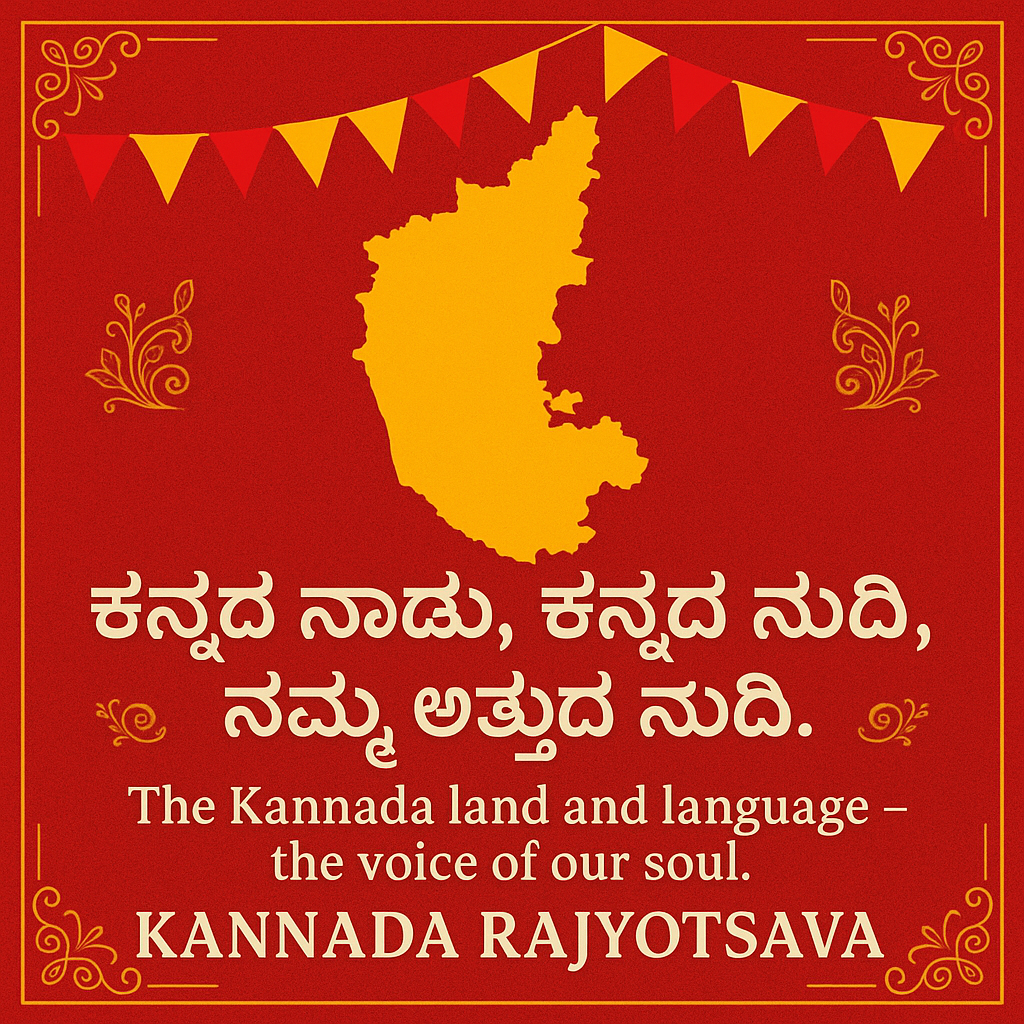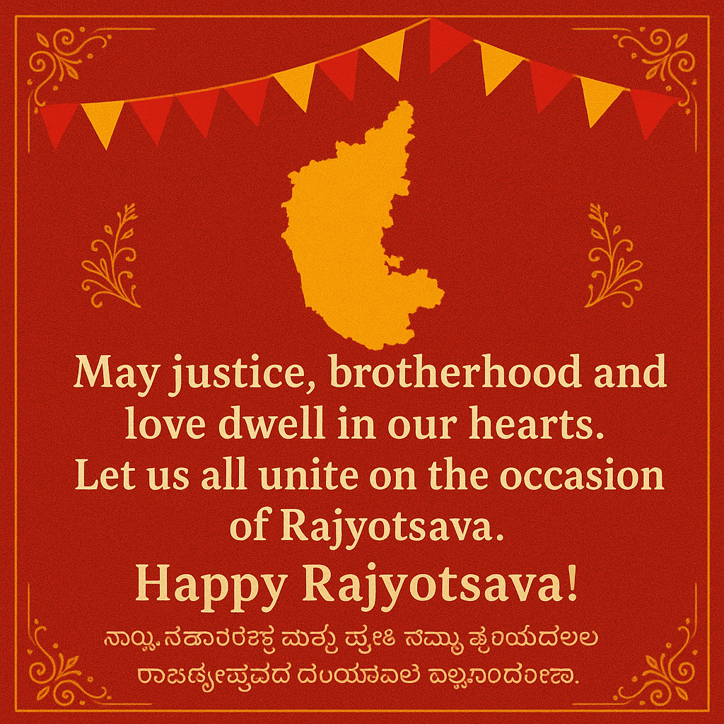 “Happy Kannada Rajyotsava! May the red and yellow colors of our flag fill your life with pride and joy. ಕನ್ನಡ ರಾಜ್ಯೋತ್ಸವದ ಹಾರ್ದಿಕ ಶುಭಾಶಯಗಳು!”