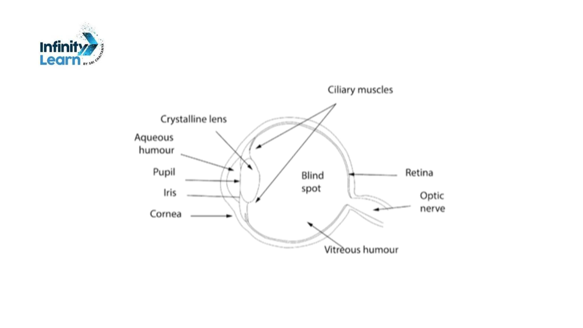 The human eye works like a natural optical instrument that focuses light on the retina for vision. Key Parts: Cornea, Iris, Pupil, Lens, Retina, Optic Nerve, Ciliary Muscles, Aqueous Humor, Vitreous Humor. Diagram: Human Eye (Labelled)